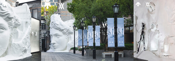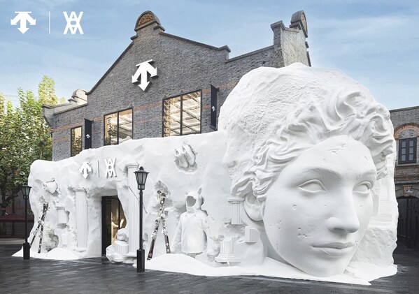 快閃空間以Daniel Arsham標志性的"未來考古學"為靈感,將侵蝕、剝離與重塑的雕塑語言融入冰雪意象,構筑出一處跳脫出時間之外的"冰雪遺跡"。建筑外立面以雪山斷面為形,仿若歷經風雪剝蝕的考古現場,巧妙聯結自然冰雪與未來想象。其中心位置特別呈現了以Daniel Arsham為迪桑特創作的雕塑《Victoria Labyrinth》為靈感的大型頭部浮雕,將冰雪語境與"未來遺跡"的藝術感巧妙融合。